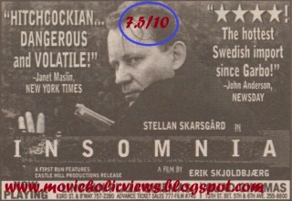 “ഇന്സോമനിയ” ശരിയായ അളവില് ഉറക്കം കിട്ടാത്ത ആളുകളില് കാണപ്പെടുന്ന മാനസികാവസ്ഥയെ ഇങ്ങനെ വിളിക്കാം.ഇത്തരത്തില് ഉള്ള പ്രമേയങ്ങള്ക്ക്സിനിമ പലപ്പോഴും പ്രധാന തീമും ആയിട്ടുണ്ട്.Fight Club,Machinsit,Insomnia(2002) എന്നീ ചിത്രങ്ങള് ഇവയില് ചിലത് മാത്രം.നോളന്റെ 2002 ല് ഇറങ്ങിയ ഇതേ പേരില് ഉള്ള ചിത്രം ഈ നോര്വീജിയന് ചിത്രത്തെ ആസ്പദമാക്കി ആയിരുന്നു.”ഇന്സോമനിയ ” എന്ന ഈ ചിത്രം പറയുന്നത് നോര്വയില് ഒരു പെണ്ക്കുട്ടിയുടെ കൊലപാതകം അന്വേഷിക്കാന് വന്ന ജോനാസ് എന്ന പോലീസ് ഉദ്യോഗസ്ഥന് നടത്തുന്ന അന്വേഷണവും അതിനെ തുടര്ന്ന് ഉണ്ടാകുന്ന സംഭവ വികാസങ്ങളിലൂടെയും ആണ്.അതീവ ശ്രദ്ധയോടെ നടത്തിയ ഒരു കൊലപാതകം ആയിരുന്നു ടാന്യ എന്ന പെണ്ക്കുട്ടിയുടെത്.തെളിവുകള് ഒന്നും അവശേഷിപ്പിക്കാതെ നടത്തിയ ആ കൊലപാതകത്തില് പെണ്ക്കുട്ടിയുടെ മുടി പോലും കഴുകിയിരുന്നു തെളിവുകള് നശിപ്പിക്കുവാന് വേണ്ടി.തെളിവുകള് ഒന്നും അവശേഷിപ്പിക്കാത്ത ബുദ്ധിപൂര്വമായ കൊലപാതകം എന്ന് വിളിക്കാവുന്ന ഒന്നായിരുന്നു അത്.